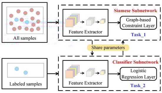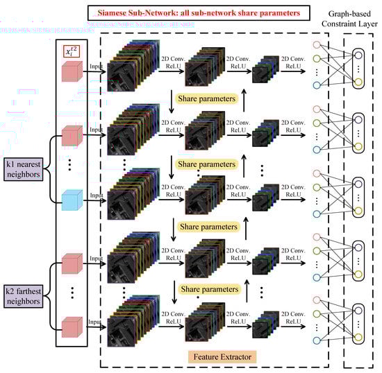 The task of Siamese subnetwork is to learn the sample relationships from and . As described in Section 2.2, represents the relationships between the target sample and its nearest neighbors and expresses the relationships between the target sample and its farthest neighbors. In order to learn the graph information in and at the same time, a novel Siamese subnetwork with subnets is designed to learn the relationship between one target sample and samples at a time, of which, the network architecture is shown in Figure 6. This is different from the traditional Siamese network, which has two subnets and only learns the relationship between two samples at a time []. In our designed Siamese network, each subnet has the same network structure as the classifier subnetwork. That is, all subnets have the same network structure with a feature extractor and a graph-based constraint layer. The point is that they share parameters.