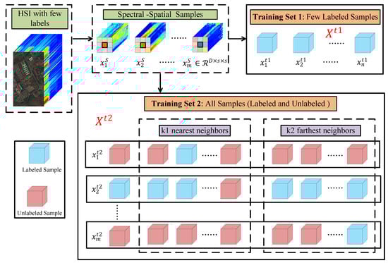 To address this problem, several different few-shot learning methods have been proposed to deal with HSI classification with few labeled samples in recent years. Few-shot learning aims to study the difference between the samples instead of directly learning what the sample is, which is different from most other deep learning methods []. As far as we know, there are three types of networks for few-shot learning for HSIs, including the prototypical network, relation network and Siamese network. The prototypical network learns a metric space in which classification can be performed by computing distances to prototype representations of each class []. In [], Tang et al. proposed a spatial–spectral prototypical network for HSIs that first implemented the local-pattern-coding algorithm for HSIs to generate the spatial–spectral vectors. The relation network learns how to learn a deep distance metric based on the prototypical network, which can precisely describe the difference in samples []. Gao et al. in [] designed a new deep classification model based on a relational network and trained it with the idea of meta-learning. The Siamese network is composed of two parallel subnetworks with the same structure and sharing parameters, in which, the input is a sample pair and the Euclidean distances are used to measure the similarity of an embedding pair. In [], a supervised deep feature extraction method based on a Siamese convolutional neural network was proposed to improve the performance of HSI classification, in which, an additional classifier was required for classification. To sum up, it is not difficult to see that these networks can be summarized as metric-based models, but they usually measure the difference only among labeled samples and ignore unlabeled samples. In practice, labeled samples in HSIs are so few and limited that the neural network can only learn so much information, while the intrinsic structure of HSI is complex and the neural network needs to learn a variety of information. Hence, deep-learning-based few-shot or even one-shot HSI classification is still a challenge.