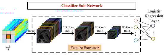 Figure 5 displays the network architecture of classifier subnetwork with a feature extractor and a logistic regression layer. In view of the strong feature extraction capability of convolutional layer, the feature extractor is a fully convolutional network. Here, the features of each layer decrease as the number of layers increases and the size of output is , so the feature extractor can also be regarded as a process of dimensionality reduction. Taking a four-layer feature extractor as an example, for input data , their output can be formulated as