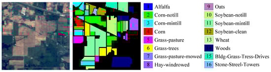 Figure 7 shows the color image and the labeled image of the IP dataset covering the Indian Pines region, northwest Indiana, USA, which was acquired by the AVIRIS sensor in 1992. Its spatial resolution is 20 m. It has 220 original spectral bands in the wavelength range 0.4∼2.5 . As a result of the noise and water absorption, 104∼108, 150∼163 and 220 spectral bands were abandoned and the remaining 200 bands were used in this paper. It contains pixels, including background with 10,776 pixels and 16 ground-truth classes with 10,249 pixels.