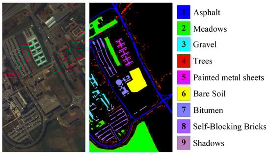 The UP dataset covers the University of Pavia, Northern Italy, which was acquired by the ROSIS sensor. Its spatial resolution is 1.3 m. It has 115 original spectral bands in the wavelength range of 0.4∼0.82 . Due to removing 12 noise bands, 103 bands are employed in this paper. It has pixels, where 164,624 pixels are background and 42,776 pixels are nine ground-truth classes. Figure 8 shows the color image and the labeled image with nine classes.