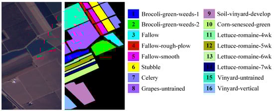 Salinas Dataset covers Salinas Vally, CA, which was acquired by the AVIRIS sensor in 1998. Its spatial resolution is 3.7 m. It has 224 original bands in the wavelength range of 0.4 to 2.45 . Due to the fact that 20 bands are severely affected by noise, the remaining 204 bands are used for this paper. Each band has pixels, including 16 ground-truth classes with 56,975 pixels and background with 54,129 pixels. The color image and the labeled image with 16 classes are shown in Figure 9.