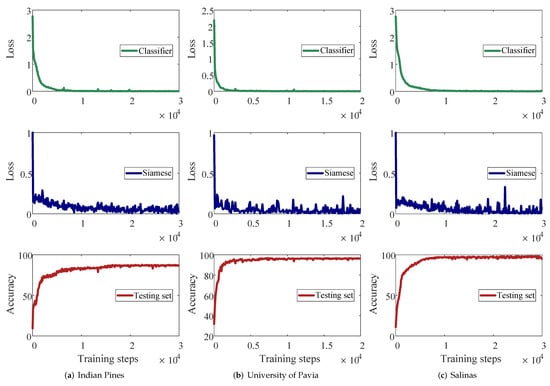 The experiment in Figure 10 was performed based on the training data of five labeled samples in each class. The first row is the classifier subnetwork loss, the second row is the Siamese subnetwork loss and the third row is the prediction accuracy of the testing set. Their learning rates are described in Section 3.2. In Figure 10, the x-axis represents the number of learning parameter updates that are performed after learning each batch of samples. The interval within the curve is 100; that is, one loss is recorded for every 100 parameter updates. From Figure 10, the classifier loss of the three datasets has a smooth convergence curve. This proves that, although the amount of training data of the classifier subnetworks is much less than that of the Siamese subnetwork, the task of the classifier subnetwork to learn the labeled samples is not interfered with by the task of the Siamese subnetwork. Though there are fluctuations, the loss curve of the Siamese subnetwork is still gradually converging, which also indicates that our designed loss function in Equation (17) has convergence. These two loss curves also show that the MFSL strategy we designed is also effective. It is worth noting that the prediction accuracy of the test set not only increases gradually with the decrease in the two losses, but also continues to increase with the convergence of the Siamese subnetwork when the classifier subnetwork has converged but the Siamese subnetwork has not. This proves that our designed Siamese subnetwork is quite advantageous for classification.