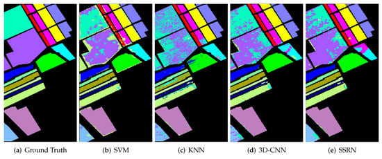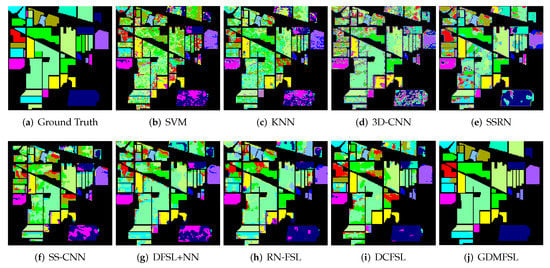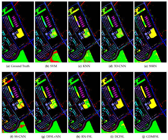 (1) Though 3D-CNN [] and SSRN [] are superior to SVM and KNN in classification when there are five labeled samples in each class, with the decrease in the number of labeled samples, the advantage of 3D-CNN [] and SSRN [] becomes less and less, and even weaker than SVM and KNN when the number of labeled samples per class is less than three. For example, in the case of one-shot sample classification in the UP dataset, the OA values of SVM and KNN are approximately 6.87% higher than those of 3D-CNN [] and SSRN []. This is because the fewer the training samples, the more serious the overfitting of deep learning methods. DFSL+NN [], RN-FSC [] and DCFSL [] solve this problem through a meta-learning strategy, whereas our GDMFSL learns the relationship among samples from the semi-supervised graph. The experimental results show that, compared with other few-shot learning methods, GDMFSL achieves a better classification performance.