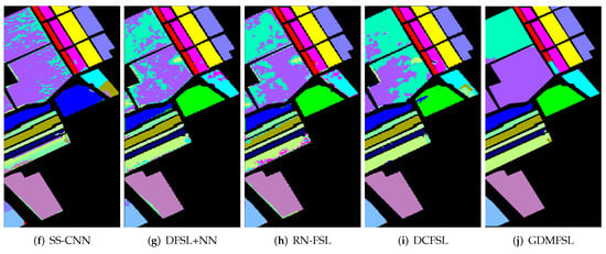 (3) Although the classification performance of SS-CNN [] is relatively weak compared with other methods in this paper, it does not mean that the semi-supervised deep learning method is unreliable. On the contrary, the experimental results of GDMFSL prove that semi-supervised deep learning is quite effective in processing hyperspectral image classification, with a small number of labeled samples when unlabeled samples are reasonably used. Compared with SS-CNN [], GDMFSL has the advantage of learning the relationship among samples.
