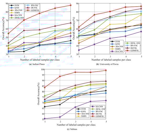 (2) As the number of labeled samples increased, the OA values of all methods increased. When there was only one labeled sample in each class, the OA values of most methods were quite low and close, whereas GDMFSL was the highest, especially on the Salinas dataset, where the OA value of GDMFSL reached 83.52%.