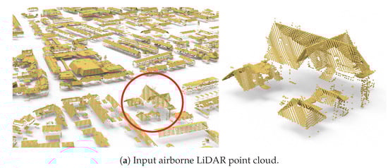 Existing urban building reconstruction methods strive to bring in a great level of detail and automate the process for large-scale urban environments. Interactive reconstruction techniques are successful in reconstructing accurate 3D building models with great detail [7,8], but they require either high-quality laser scans as input or considerable amounts of user interaction. These methods can thus hardly be applied to large-scale urban scenes. To facilitate practical applications that require large-scale 3D building models, researchers have attempted to address the reconstruction challenge using various data sources [9,10,11,12,13,14,15,16]. Existing methods based on aerial images [10,12,13] and dense triangle meshes [11] typically require good coverage of the buildings, which imposes challenges in data acquisition [17]. Approaches based on airborne LiDAR point clouds alleviate data acquisition issues. However, the accuracy and geometric details are usually compromised [9,14,15,16]. Following previous works using widely available airborne LiDAR point clouds, we strive to recover desired geometric details of real-world buildings while ensuring topological correctness, reconstruction accuracy, and good efficiency.