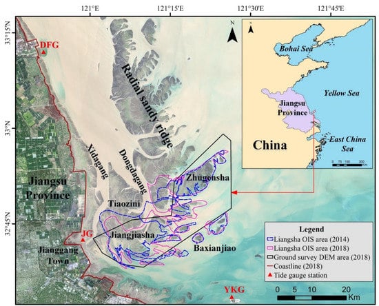 Jiangsu Province is located on the middle-eastern coast of China. Along its open coast facing the southern Yellow Sea, a unique radial sandy ridge system with more than 70 sand ridges and tidal channels extending approximately 200 km from north to south and 90 km from east to west has developed [,]. In the last decade, wind power has made rapid progress in the core region of the radial sandy ridge outside of JiangGang town. In this study, the Liangsha area (Figure 1), especially the Jiangjiasha and Zhugensha sand bodies, was selected as a test site for the DEM generation and wind turbine-influenced morphological change analysis.