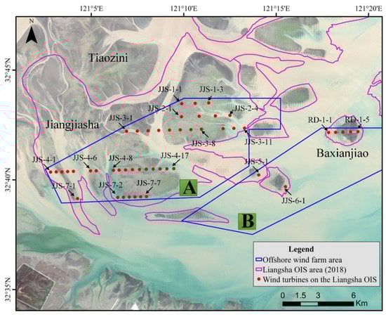The analysis of Sentinel-2 high-spatial-resolution satellite remote sensing images for the years 2016 to 2018 revealed many offshore wind turbines within the offshore sandbanks. Taking the common scope of the Liangsha OIS area in 2014 and 2018 as a reference, the locations of 49 wind turbines on the Liangsha OIS were automatically extracted from the geo-rectified Sentinel-2 satellite data imaged on 9 April 2018. Figure 2 shows their spatial distribution. These wind turbines were arranged in eight rows, of which seven rows were located in the Jiangjiasha sea area and labeled from JJS-1 to JJS-7, and one row was located in the Baxianjiao sea area with the label of RD-1.