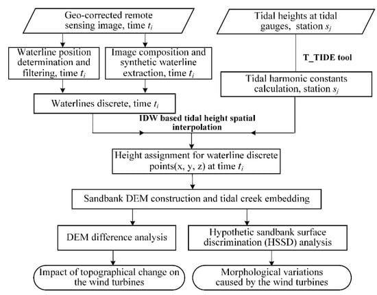 The assessment of marine wind turbine-induced topographical changes in the OIS involves two main methods: (1) the enhanced waterline method (EWM), to construct the high-accuracy DEM, which can meet the need to monitor variations of small targets spatially, and (2) the hypothetical sandbank surface discrimination method (HSSDM), to analyze the topographical changes caused by the wind turbines based on the DEM dataset. The overall methodology of the study is shown as a flowchart (Figure 3).