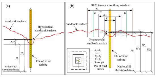 Figure 4b shows the HSSE estimation method by the smooth-window averaging process. Taking the central location of a given wind turbine as the center of the terrain smoothing window, we can set a series of windows with different sizes, Ri. These windows cover different areas of the sandbank surface that may contain tidal ridges, tidal channels, or both, and have varied mean elevations. Naming the mean elevation of the window i as the variable, it shows the undulation of the background terrain under different sizes around the wind turbine. Therefore, if the sizes and number of the windows are determined, the average value of can be treated as the HSSE to represent the mean variation of the background terrain as there is no wind turbine built.