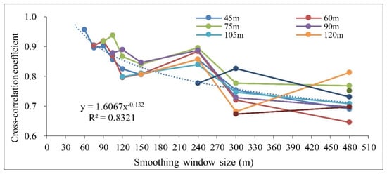 The variation trends of the cross-correlation coefficient for the HSSE calculated under the specified smoothing window sizes of 45 m, 60 m, 75 m, 90 m, 105 m, 120 m, 150 m, 240 m, and 300 m.
