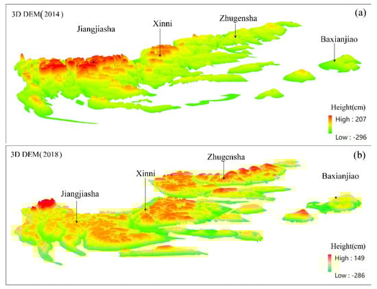 The 3D format of Liangsha OIS DEM constructed by the EWM. (a,b) are the DEMs for 2014 and 2018, respectively.