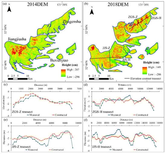 DEM accuracy analysis. (a,b) are the plain view of Liangsha OIS DEM. (c–f) compare measured and constructed DEM elevations along transects ZGS-Z, ZGS-H, JJS-Z, and JJS-H for the year 2018.