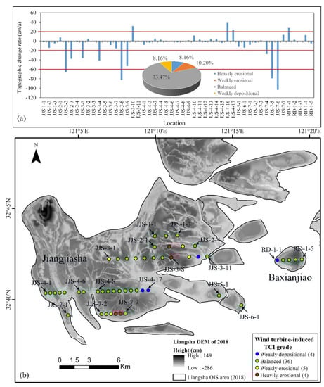 Based on two DEMs in the years 2014 and 2018 representing the morphology before and after the construction of the Liangsha wind farm, elevation variations were calculated to analyze the impact of topographic changes on the safety and stability of the wind turbines. The erosional/depositional depths at the central positions of the 49 OIS wind turbines were divided into three groups, which are shown in Figure 9. The locations of seven wind turbines were weakly erosional with erosion depths ranging from −198 cm to −80 cm, and 11 locations were weakly depositional with deposition depths between 80 cm and 106 cm. They, respectively, occupied 14.29% and 22.45% of the total number of wind turbines in the Liangsha OIS. The locations of the remaining 31 wind turbines were in the erosional/depositional balanced state, accounting for 63.27%.