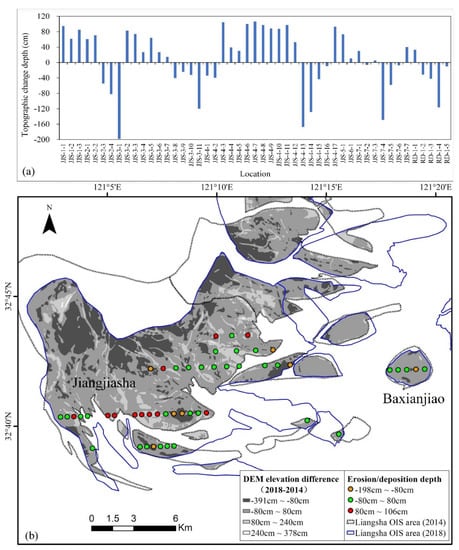 Topographic changes of the Liangsha OIS between 2014 and 2018. (a) Topographic change depths of the Liangsha OIS at the locations of the 49 wind turbines. (b) Spatial distribution of three erosional/depositional depth groups.