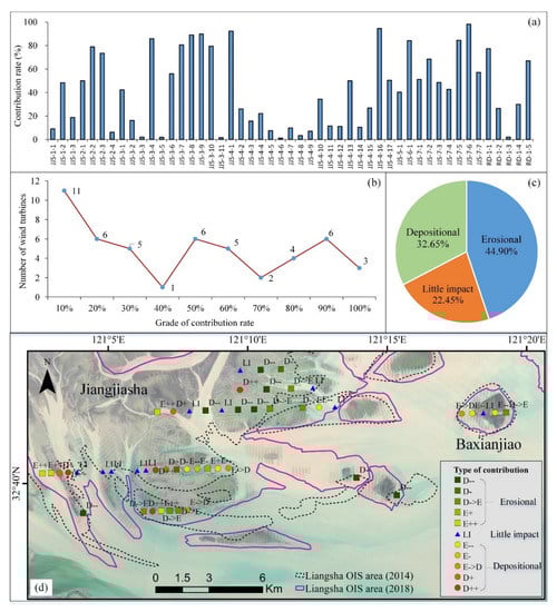 Since the terrain changes caused by wind turbines and by natural forces may not synchronous, according to different terrain change types and their correspondent ranges of contribution rates, the detailed contributions that wind turbines exerted on the Liangsha OIS are categorized and listed in Table 2. For the type of contribution, ‘D’, ‘E’, and ‘LI’ represent depositional, erosional, and little impact, respectively. ‘-’ represents a slight decrease, ‘--’ represents a great decrease, ‘->’ means conversion, ‘+’ represents a slight increase, and ‘++’ represents a great increase. Figure 10d shows the types of contribution for terrain change at the locations of 49 wind turbines.