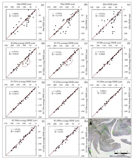 Correlation analysis for HSSE results under different scenarios. (a–c) are the comparison under the single smoothing window. (d–k) are the comparison between the different average schemes and our adopted average scheme. (l) displays the actual locations of the five scattered points in (d,e).