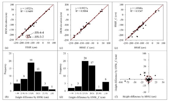 The comparison of the HSSE with the DEM height of the terrain. (a) The linear correlation between the DEM elevation and the HSSE. (b) The frequency histogram showing the range of height difference by HSSE. (c,d) are the results between the DEM elevation and the HSSE_C. (e,f) are the linear correlation and the spatial distribution of height difference between the HSSE and HSSE_C.
