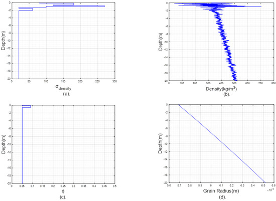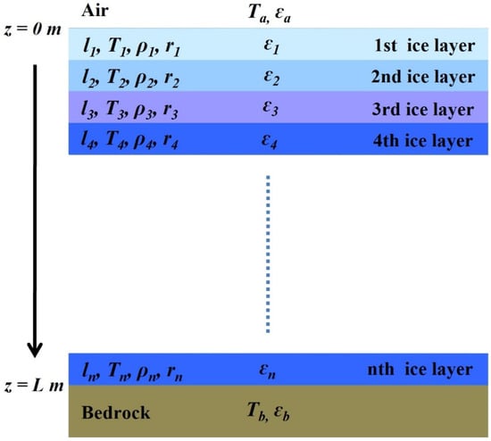 The polar firn can be considered as a planar layered medium, as illustrated in Figure 1, where each layer is described by its temperature, density, and grain size [19]. Section 2.1.1, Section 2.1.2, Section 2.1.3, Section 2.1.4 and Section 2.1.5 describe the depth-dependent models for these layer parameters used in this study.