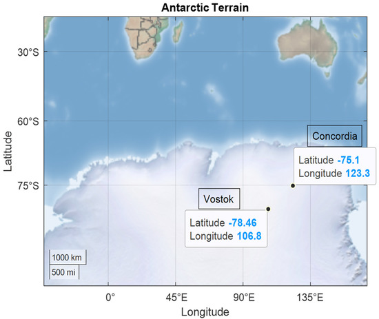 where is the grain radius profile versus depth, is the grain radius at the surface in millimeters, is depth in meters, is the grain size gradient in square millimeters per meter. In situ measurements have also demonstrated that the size of ice particles at Concordia is almost double that of at Vostok, as shown in Figure 2 [21,22]. In this study, using linear regression fits to these measurements, grain radius profiles at Concordia and Vostok Stations, locations of which can be seen in Figure 3, have been modeled as: