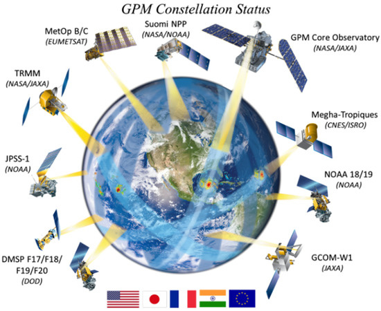 The Global Precipitation Measurement (GPM) mission, shown in Figure 7, is an international constellation-based mission designed to combine and improve precipitation measurements from several operational microwave sensors. None of the GPM members were built and launched specifically for the GPM mission. The individual satellites were designed and deployed by their respective space agencies for their own weather programs, but the international community, led by the National Aeronautics and Space Administration (NASA) and the Japan Aerospace Exploration Agency (JAXA), decided to incorporate the measurements from these satellites for consistent precipitation products with larger global coverage [32,33].