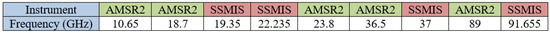 The Advanced Microwave Scanning Radiometer-2 (AMSR2) is a seven-frequency radiometer which provides measurements at a fixed 55° incidence angle [36,37]. It measures brightness temperatures in both vertical and horizontal polarizations at 6.9 GHz, 7.3 GHz, 10.65 GHz, 18.7 GHz, 23.8 GHz, 36.5 GHz, and 89 GHz with spatial resolutions ranging from 3 km × 5 km to 35 km × 62 km.