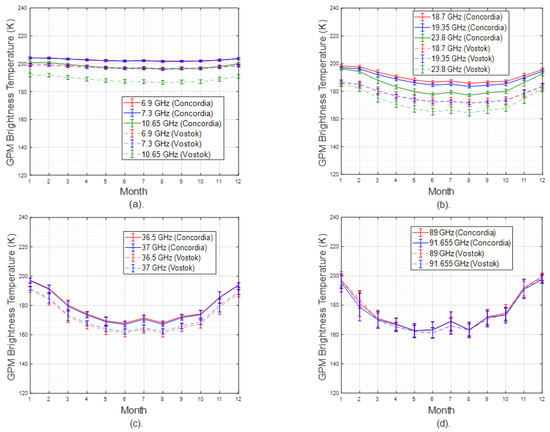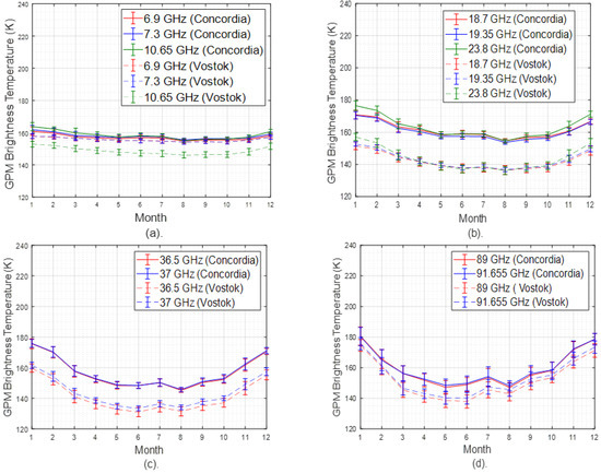 Figure 9 depicts the horizontally polarized brightness temperatures versus month, with ranges of monthly standard deviations, over Concordia and Vostok Stations between January 2020 and June 2021 at all above-mentioned AMSR2 and SSMIS frequencies (except 22.235 GHz since only vertically polarized brightness temperatures are available at this frequency). Figure 10 demonstrates the same brightness temperatures in vertical polarization. It can be seen from the figures that at low frequencies, e.g., 6.9 GHz, 7.3 GHz, and 10.65 GHz, the brightness temperatures do not vary significantly throughout the year. At higher frequencies, e.g., 89 GHz and 91.65 GHz, on the other hand, the seasonal variations can be as large as 35 K. As expected in the Southern Hemisphere, the maximum brightness temperatures are observed in December–January and the lowest brightness temperatures are measured between May and September. Moreover, due to the lower reflection between ice and air in vertical polarization, vertically polarized brightness temperatures are slightly higher than horizontally polarized brightness temperatures. Finally, except at the two highest frequencies, measurements over Concordia Station have been found to be warmer than those over Vostok Station in both polarizations.