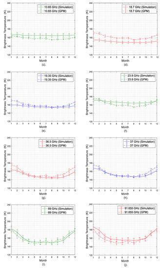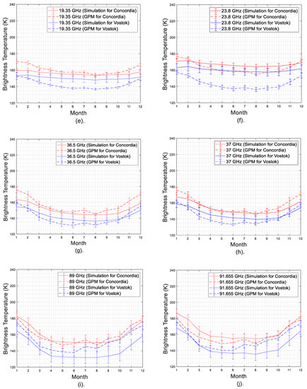 Horizontally measured polarized brightness temperatures over Concordia Station versus simulations as described in Section 3.1.2 at frequencies (a) 6.9 GHz; (b) 7.3 GHz; (c) 10.65 GHz; (d) 18.7 GHz; (e) 19.35 GHz; (f) 23.8 GHz; (g) 36.5 GHz; (h) 37 GHz; (i) 89 GHz, and (j) 91.65 GHz. Note that simulations demonstrate similar seasonal trends with satellite measurements.