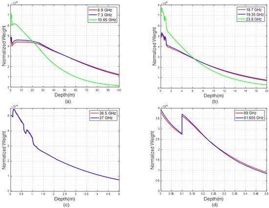 Normalized weight functions versus depth at frequencies (a) 6.9 GHz, 7.3 GHz, and 10.65 GHz; (b) 18.7 GHz, 19.35 GHz, and 23.8 GHz; (c) 36.5 GHz and 37 GHz; and (d) 89 GHz and 91.65 GHz. Note that these functions were calculated using the density and grain size profiles shown in Figure 12.