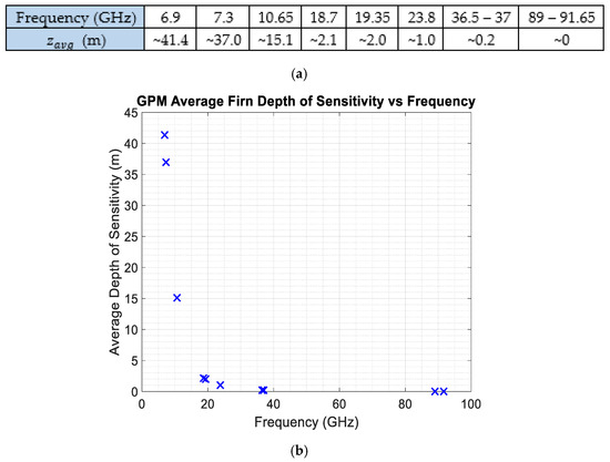 Average firn depths of sensitivity at AMSR2 and SSMIS frequencies and incidence angles as calculated via Equation (20) using the normalized weight functions shown in Figure 13. (a) Table illustrating depth sensitivity values; (b) plot of average depths of sensitivity versus frequency.