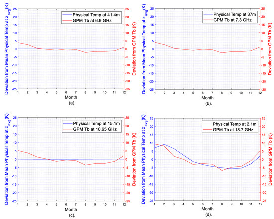 Physical temperature of the firn is another major factor determining the surface brightness temperature and can be probed at different depths using microwave radiometry. This can be demonstrated by investigating the correlations between the brightness temperatures measured by the GPM radiometers and the physical temperatures of the Antarctic firn at average depths of sensitivity associated with the GPM frequencies. Figure 17 illustrates these correlations at Concordia Station. The correlations have been demonstrated by co-plotting the deviations of the measured brightness and physical temperatures around their annual mean. As mentioned previously, deep firn is isothermal; thus, no significant variations in brightness temperatures at 6.9 GHz, 7.3 GHz, and 10.65 GHz have been observed. Similarly, physical firn temperatures at 41.4 m, 37 m, and 15.1 m depths, i.e., average depths of sensitivity for 6.9 GHz, 7.3 GHz, and 10.65 GHz, follow a constant pattern throughout the year, showing a high correlation. On the other hand, as frequency increases, i.e., as the average depths of sensitivity decrease, the brightness temperatures at higher frequencies reflect the seasonal physical temperature variations in shallow firn. For example, at 89 GHz and 91.65 GHz, the measured brightness temperatures vary ~35 K between summer and winter. On the other hand, the physical temperatures at the firn surface deviate from the annual mean in a similar manner. These high correlations confirm the potential of extracting thermal properties of polar firn using wideband or multifrequency radiometer such as the GPM radiometer constellation.
