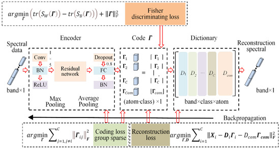 Figure 1 presents the pipeline of the developed framework, with a CNN constructed to encode the spectral information, as well as a structured dictionary established to classify HSIs. Spectral data are first encoded by the CNN model, in which residual networks are used to optimize the main networks. We can acquire the group sparse code using the full connection layer. Meanwhile, two loss functions, i.e., coding loss and Fisher discriminating loss, are calculated to optimize code coefficients. More importantly, a discriminative dictionary is constructed by reconstruction loss to enhance the discriminative ability of the developed model.