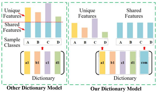 The first term of Equation (3) is the reconstruction loss which is used to construct the structure dictionary. Each sub-dictionary is established and learned from ith class samples. The second term for Equation (3) is the coding loss. However, the structure of existing dictionary needs optimization to learn common and specific features of HSI samples. As depicted in Figure 3, the test samples contain the common characteristics, i.e., the features they shared. To solve this problem, we design the shared constraint for sub-dictionaries. Our shared constraint (the com sub-dictionary) is built to describe duplicated information (common characteristics in Figure 3). Then, the discriminative characteristics will be “amplified” relative to the original characteristics.
