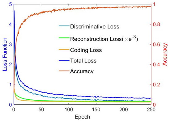Two kinds of discriminative loss functions can be implemented by programming. One is Fisher discriminative loss and the other is cross-entropy loss . Both loss functions have been implemented in the program, and we will provide two versions of the final program for researchers. In this paper, all of the results are calculated with cross-entropy loss. Figure 4 shows the variation trend of three loss function values and classification accuracy with increasing epoch. All loss functions are convergent, and our approach achieves excellent classification accuracy. Therefore, the final objective function is as follows: