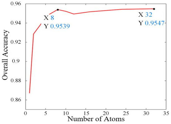 We set all the subdictionaries to have the same number atoms. The number of atoms is adaptively estimated with Houston 2013 datasets, as depicted in Figure 5. The classification OA increases with the number of atoms for each sub-dictionary (atom number under 8), while the changes in OA are not enormous along with the variation in atom number beyond 10. We set the number of atoms to 8 for each dataset to efficiently train the developed model.