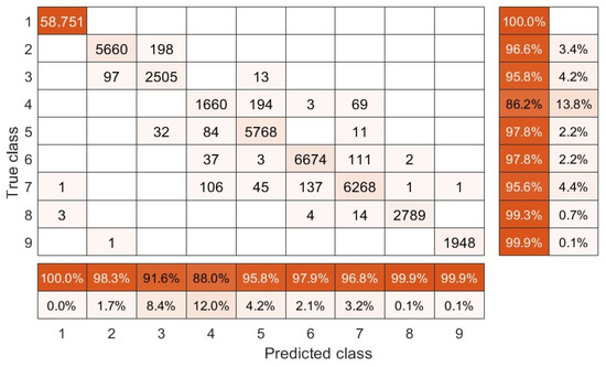 The confusion matrix of the developed model on the Center of Pavia dataset.