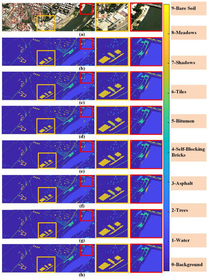 Figure 8 presents the classification maps acquired by various methods on the Center of Pavia data set. Figure 8a,h are the pseudo-color image and ground truth map, and Figure 8b–g depicts the corresponding classification maps of FDDL, DPL, ResNet, RNN, CNN, and the proposed model, respectively. It can be seen that our method shows better visual performance than the dictionary and CNN-based algorithms in both the smoothness in same material region and sharpness on the edges between different material one. For better comparison, we highlight river bank and building regions with red and yellow rectangles in Figure 8. In terms of the classification results in the red rectangle, all of the methods, except the CNN model and our method, incorrectly classify some water samples into Bare Soil class. As for the yellow rectangle region, our model achieved smoothest classification results on Bara Soil class in which CNN method confuses some samples into Bitumen class, which leads to a inferior score when comparing with our proposed algorithm.