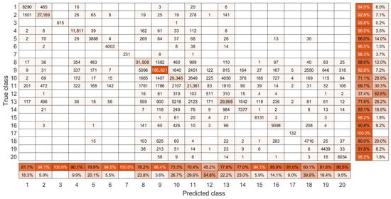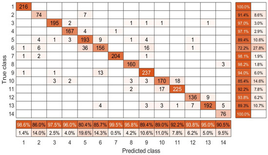 The classification results achieved by the methods in comparison on the Houston 2013 dataset are presented in Table 3, and Figure 11 presents the confusion matrix relative to the developed model. As depicted in Table 3, the classification results is more than higher than other methods on classes Commercial, Road, Highway and Parking Lot 1, while it performs competitively with other methods for other classes. Specifically, for Stressed Grass class, our method only is lower than AE method and lower than CNN method, but almost two percent in average higher than the other methods. It is noteworthy that the developed algorithm outperforms other operators in feature extraction generally for OA, AA and kappa with , , and , respectively. Furthermore, the confusion matrix in Figure 11 also reveals that the algorithm here can be effective to distinguish a surface region.