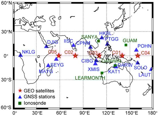 Blue triangles represent locations of MGEX stations, and the green squares represent ionosonde stations. The red stars represent projections of BeiDou Navigation Satellite System Geostationary Earth Orbit (BDS-GEO) satellites on the ground.