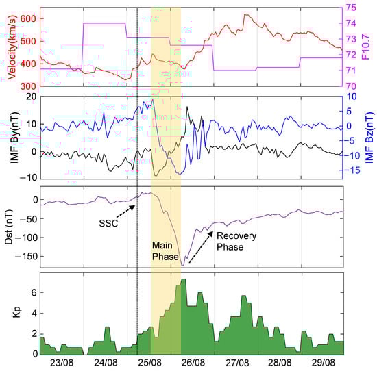 Temporal variations of solar wind velocity, IMF-Bz component, Dst and Kp indexes during 23–29 August 2018. The yellow shadow shows the period of the storm main phase.
