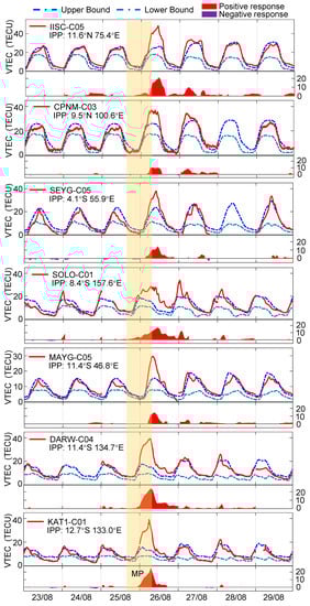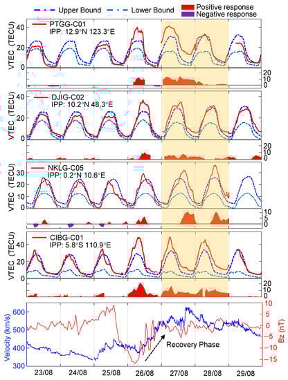 Diurnal variations of Geostationary Earth Orbit (GEO) total electron content (TEC) and corresponding upper bounds and lower bounds calculated from the global ionospheric map (GIM) model over different stations during 23–29 August 2018. The red and purple areas represent positive signatures and negative signatures, respectively. The yellow vertical bar is the duration of the main phase. The VTEC is vertical TEC, and the TECU is TEC Units.