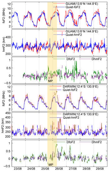 Figure 4 shows the variation of critical frequency () and peak height (), as well their relative deviations from 23–29 August 2018 at DARWIN and GUAM stations. The peak height of F layer is often used to study the possible driving force of an electrodynamic source to uplift or decrease the ionospheric F layer. In Figure 4, the observed from DARWIN and GUAM stations shows an obvious enhancement up to nearly 10 MHz on 26–27 August 2018. The of both two stations even increases to around 0.6–0.8, which indicates that the ionosphere generates a positive disturbance response during the main phase of the geomagnetic storm in August 2018. The of DARWIN station has the same trends with , with an increase to 380 km on 26 August. During the recovery phase of the storm, the and of two ionosonde stations have no prominent disturbance compared with the averaged quiet days.