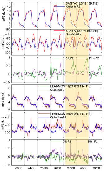 The and (red lines) and corresponding averaged quiet values (blue lines) at SANYA and LEARMONTH stations. The green and purple lines represent and , respectively. The yellow bars represent disturbance duration during the recovery phase.