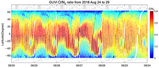 Variation of O/N2 ratio from TIMED/GUVI during 24–29 August 2018.