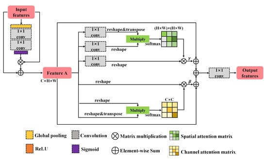 At the same time, feature D is reshaped to , multiplied by the transpose of S, and then reshaped back to . Finally, it is multiplied by a scale parameter and then employs element-wise summation with A to obtain the feature matrix map :