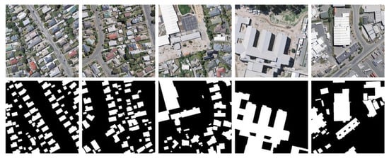 WHU Building Dataset [42]: The dataset adopted for our experiments is the aerial image dataset of the WHU Building Dataset. The dataset covers a 450 km2 area in Christchurch, New Zealand, which includes residential, industrial, cultural, and rural areas, and contains 187,000 buildings with different textures, shapes, and colors. This area is evenly divided into 8189 images of 512 × 512 pixels in tif format. The dataset for our experiment is divided randomly, and the training set, validation set, and test set contain 4736, 1036, and 2416 images, respectively. The original images and ground-truth values in the WHU Building Dataset are shown in Figure 3.