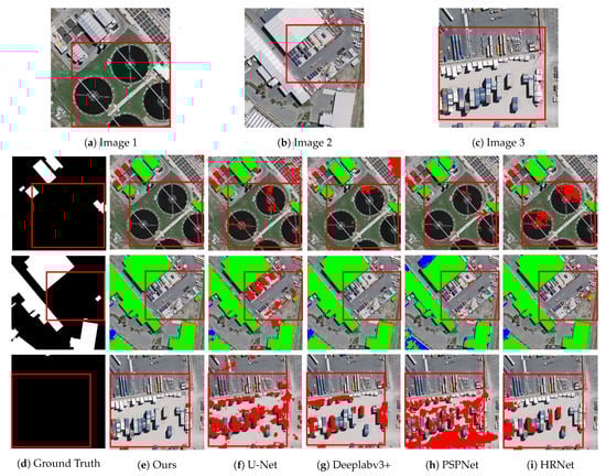 Results of different methods on easily confused buildings. (a–c) Original input images; (d) ground truth; (e–i) the results of our method and the other four methods, respectively. Green, red, and blue pixels on the map represent predictions of true positives, false positives, and false negatives, respectively. The experimental results in the red box show the areas where the contrast effect is more obvious.