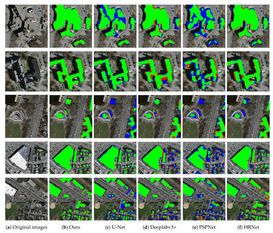 Extraction results of different methods for different types of buildings on the Massachusetts Building Dataset. (a) Original input image; (b–f) the results of our method and the other four methods, respectively. Green, red, and blue pixels on the map represent predictions of true positives, false positives, and false negatives, respectively.
