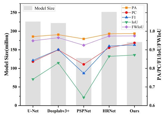 Comparison of experimental results and model sizes of different methods. Line graphs with different colors represent the results of different evaluation metrics. The histogram represents the model sizes of different methods.
